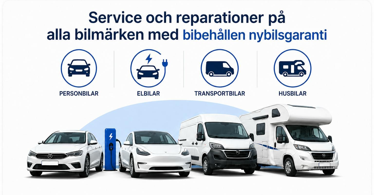 Vi erbjuder professionell service och reparationer för personbilar, elbilar, transportbilar och husbilar – alltid med nybilsgaranti i behåll.